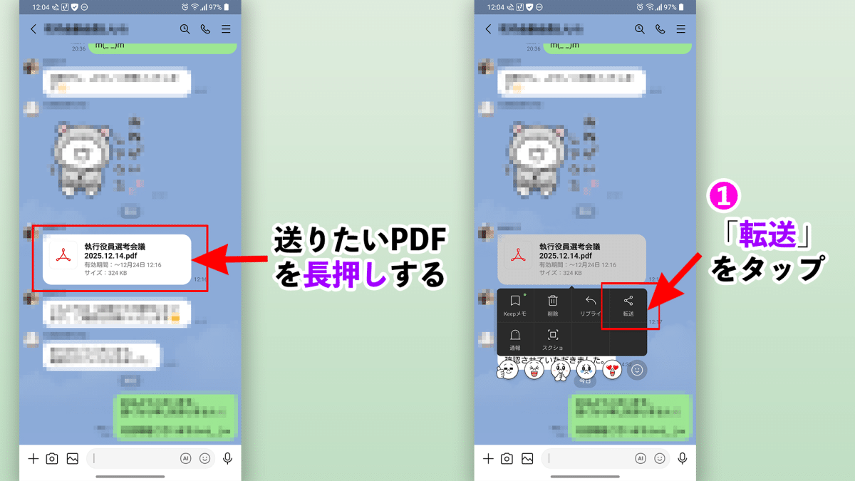 ①LINE上にあるパソコンに送りたいPDFファイルの「転送」をタップ