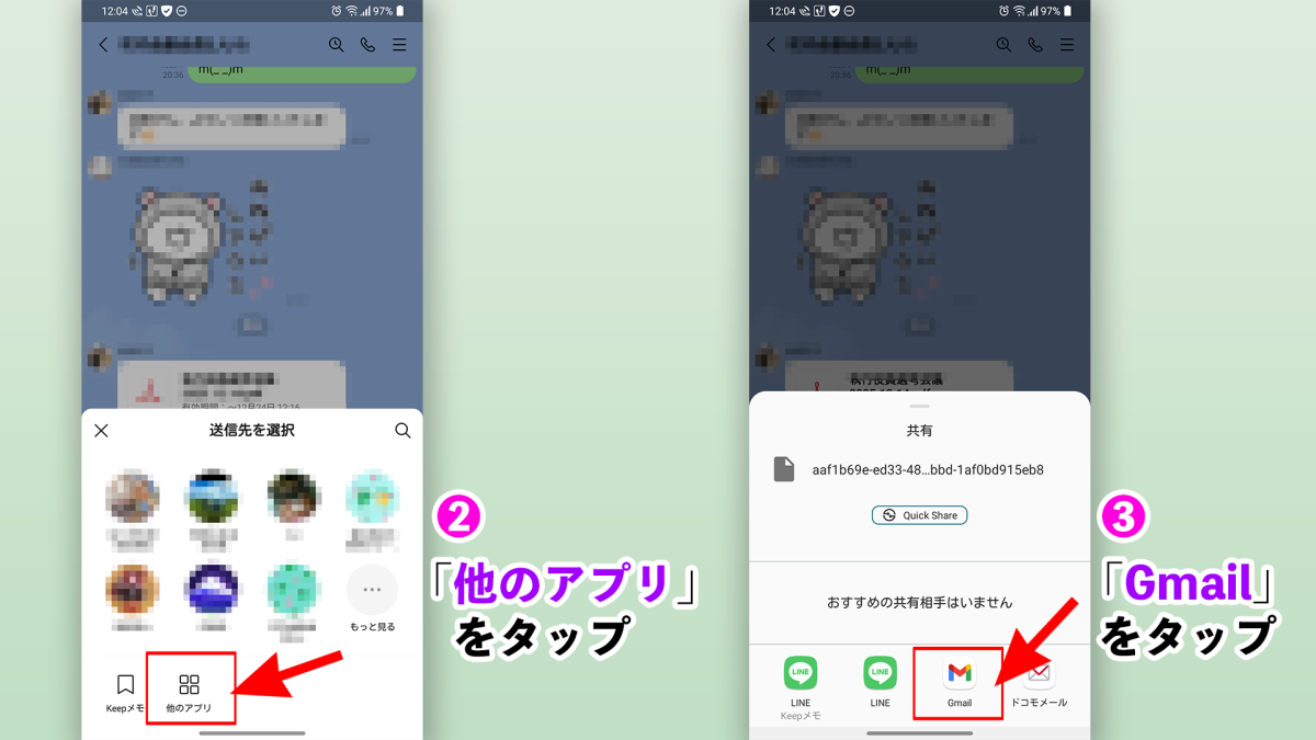 手順③のアプリをGmailアプリではなく、お使いのメールアプリを選び、ご自身のメールアドレス宛にメールを送る方法ですね。