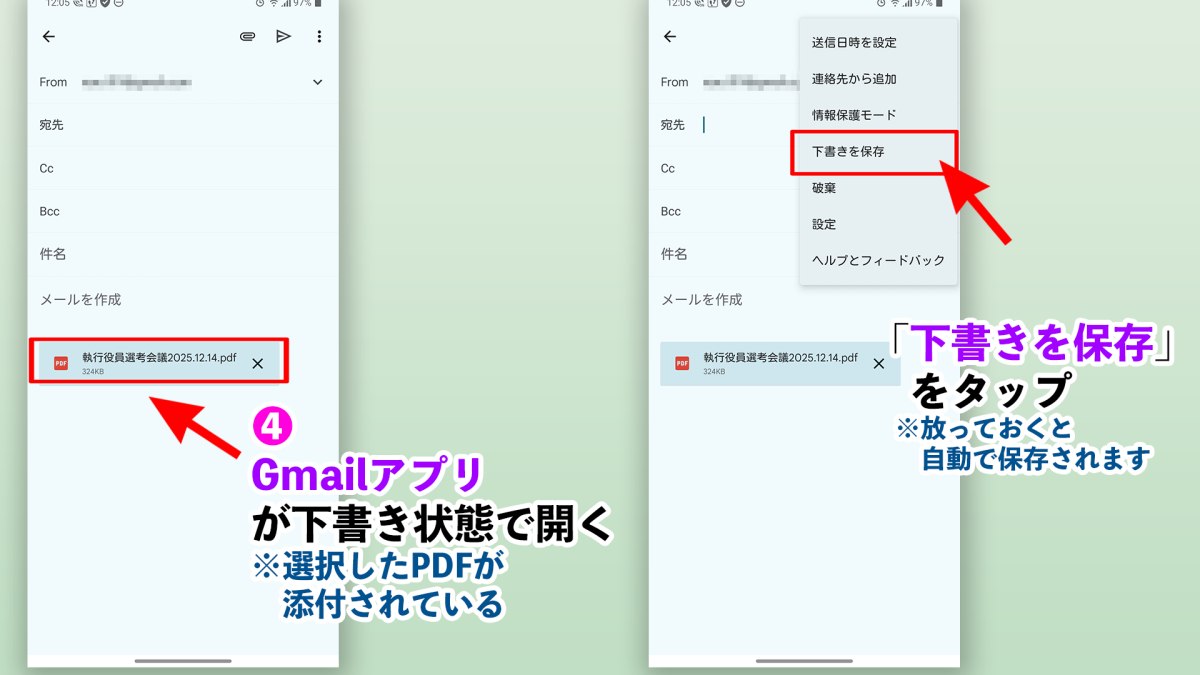 ④Gmailアプリが起動し、メールの下書きの状態になるので「下書きを保存」する。もしくは自動で保存される