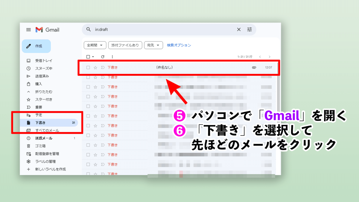 ⑥「下書き」を選択し、先ほど保存したメール下書きをクリック