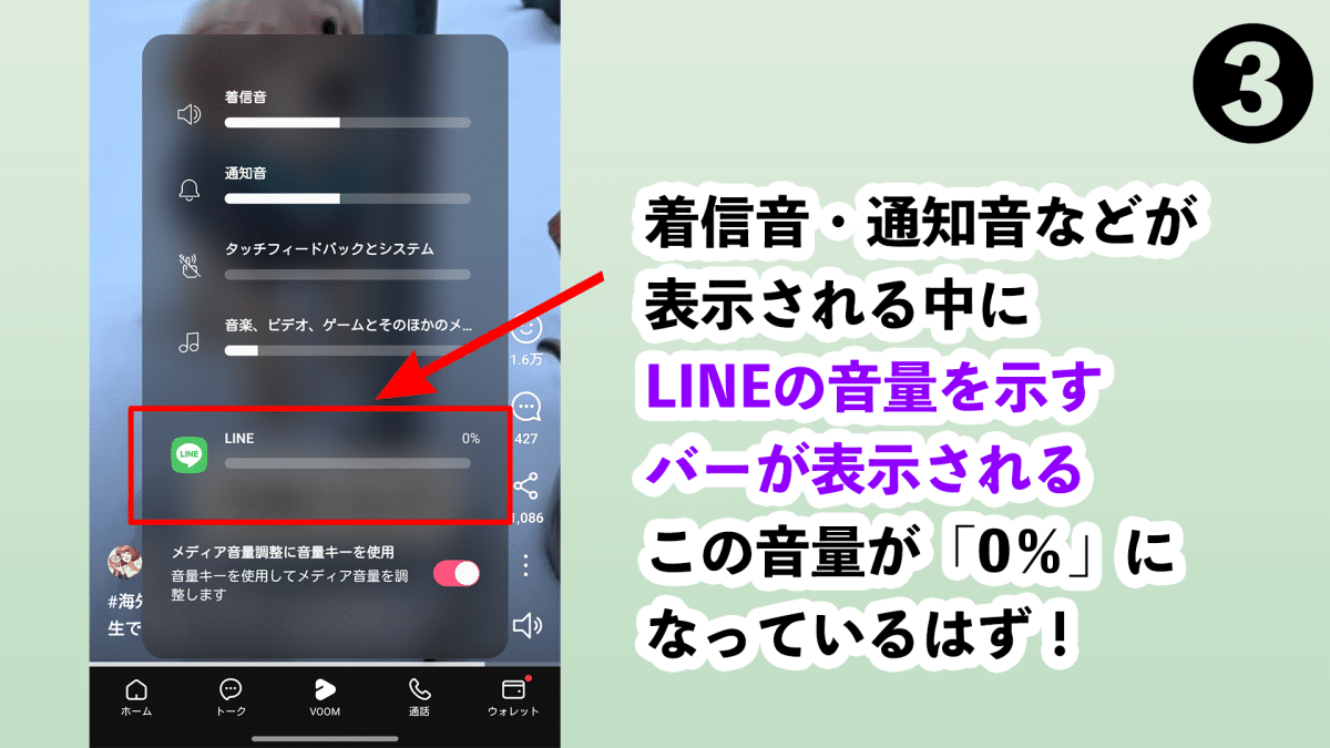 このLINEの音量が「0%」になっているはず!